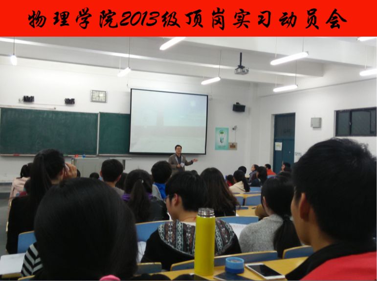 为进一步推动后宫电影院 顶岗实习活动的开展,使学生全方位了解顶岗实习的过程和意义,2015年11月3日,物理科学与信息工程学院在公教楼A106开展了顶岗实习动员大会。本次大会由2013级辅导员刘翌欣主持,后宫电影院 党委副书记顾连忠、第十八期顶岗实习驻县教师潘浩及第二十期优秀实习生董亚、徐文博为全体2013级本科师范生作动员。