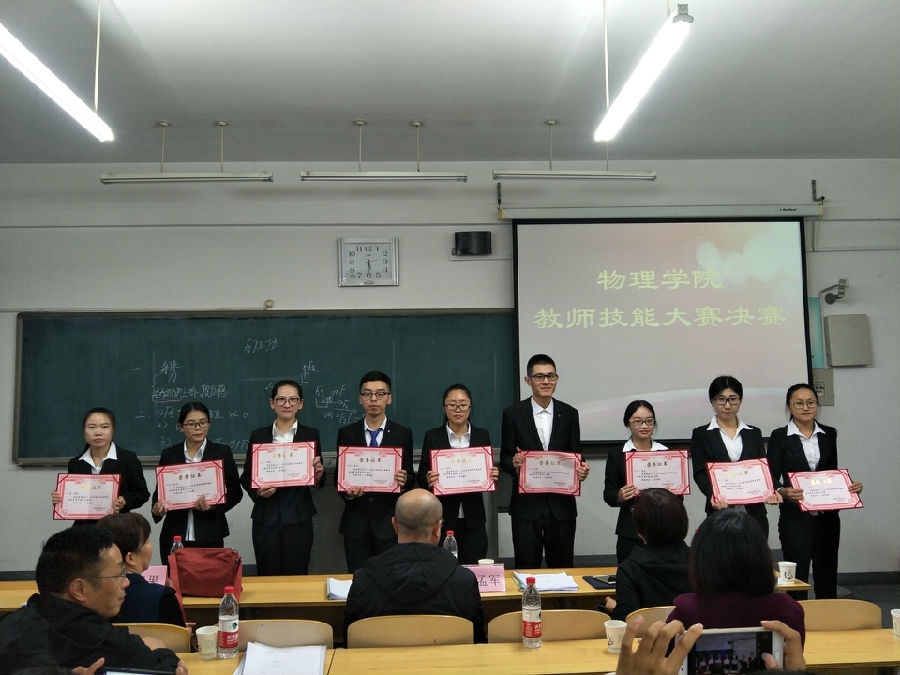 比赛分为教学设计、模拟授课、现场问答三个环节。评委老师从教师口语、教态、授课内容设计、重难点把握、教学方法、多媒体使用、板书设计等方面对选手进行综合考核。各参赛选手充分备课,课堂教学目的明确,教学思路清晰,教学过程设计合理,语言表达准确精炼,教学方法独特新颖。选手流畅的讲解,优美的板书,端庄大方、挥洒自如的仪态,展现了较好的教学技能和教师风采。最终许焱、张丽、巨婉莹等三位同学获得比赛一等奖,周帅等九位同学获得比赛二等奖。