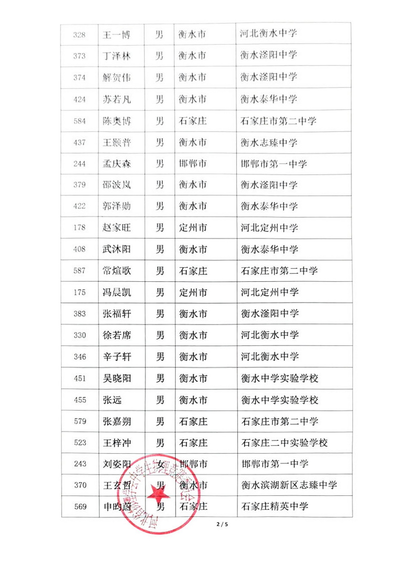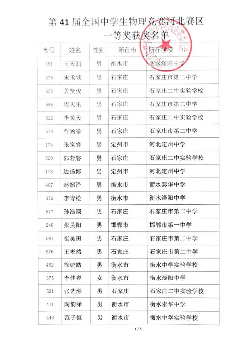 第41届全国中学生物理竞赛河北赛区一等奖获奖名单