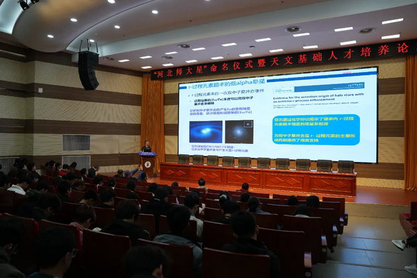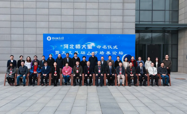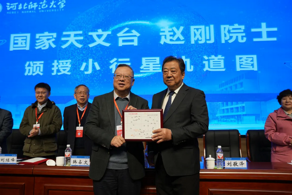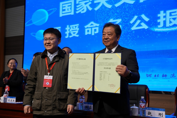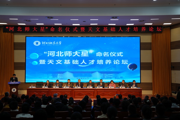 11月11日,“河北师大星”命名仪式在学校会议中心报告厅举行。中国科学院国家天文台台长刘继峰,中国天文学会理事长、中国科学院院士、云南天文台研究员韩占文,中国科学院院士、国家天文台研究员赵刚,国家天文台教育处处长梁艳春,国家天文台研究员邹虎,中国科学院高能物理研究所研究员王建民,中国科学院上海天文台研究员路如森出席。校党委副书记、校长刘敬泽致辞。党委常委、副校长刘英主持。中国科学院国家天文台相关工作人员,学校相关单位主要负责人和师生代表200余人参加命名仪式。