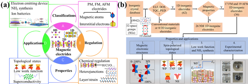 (a)多维度磁性电子化合物的分类、调控、特性和应用。(b)一维磁性拓扑电子化合物的筛选、特性、实验和应用流程图。